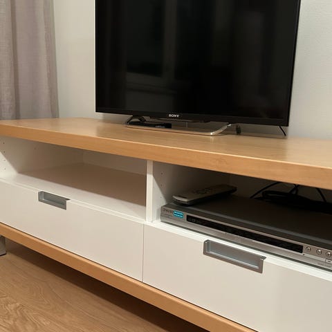 Myydään hyvässä kunnossa oleva tv-taso. Yksi pieni kolhu ja hieman kulumaa kulmissa. Näistä kuvat. Kiiltävä pinta. Erittäin kevyt, pystyy kantamaan kasattuna.