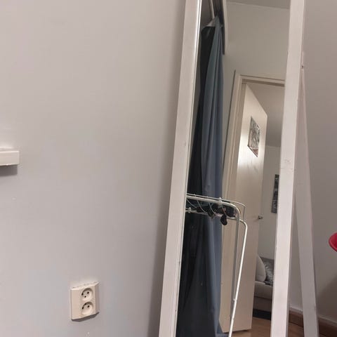 Ikea kokovartalopeili valkoisella kehyksellä. Peili soveltuu esimerkiksi eteiseen tai makuuhuoneeseen seinälle kiinnitettäväksi tai nojaamaan seinää vasten. Kehyksessä on pieniä käytön jälkiä, jotka näkyvät kuvissa. Nouto Hermannista, Helsingistä.