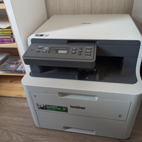 Brother DCP-L3550CDW monitoimilaser tulostin. Laitteessa on värilasertekniikka, automaattinen arkinsyöttö ja useita liitäntöjä, kuten USB ja verkkoliitäntä. Sopii asiakirjojen tulostamiseen, kopiointiin ja skannaukseen kotona tai toimistossa. Mallikilvessä näkyvät sarjanumero ja CE-merkinnät. Väri vaalea/harmaa.