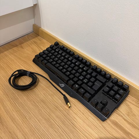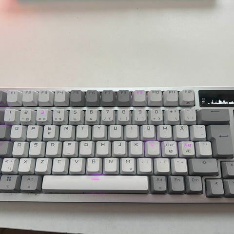 täysin ehjä ja hyvin pidetty näppäimistö 65% ja punaiset asuksen kytkimet, jotkin näppäinhatut ovat mustia koska olen tussilla niitä väritellyt kerran muttei vaikuta mitenkään laitteen toimivuuteen muuten kuin uusi. Uudet näppäinhatut ei paljoa maksa ja nämäkin oikein hyvät vähän vain rumat nuo jotkut. Näppäimistö maksoi lähemmäs 200€ kun ostin tämän.