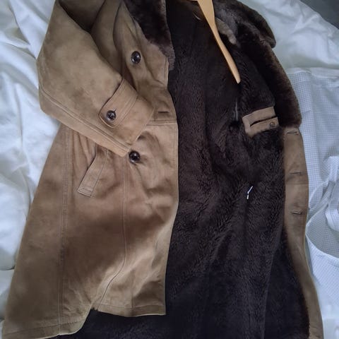 Mokkanahkainen miesten ruskea kelsitakki. Aito turkiskaulus, vuori tekokarvaa. Kainalo-kainalo 53 cm, olka-helma 98cm. Nappeja siirtämällä n 10cm lisää leveyttä. Hinta 30€. Nouto.