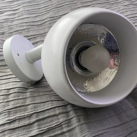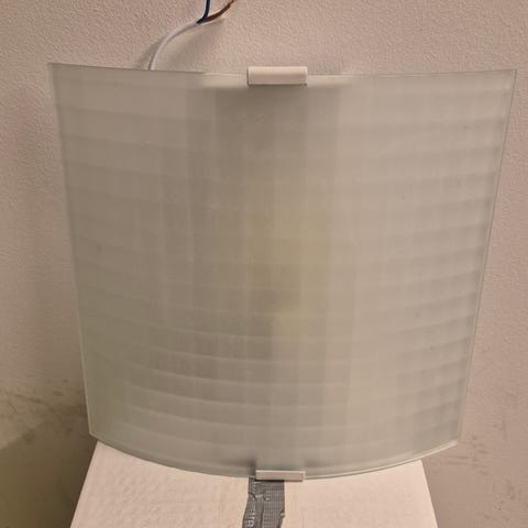 Keltalasinen ulkovalaisin seinään. Pituus 35 cm, lasipallon halkaisija 18 cm.