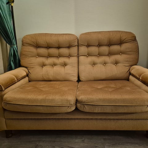 Myydään vanha aito vintage sohva. Kangas on ehjä ja alkuperäinen sekä nyppääntynyt. Jalat ovat puiset.