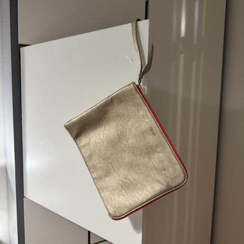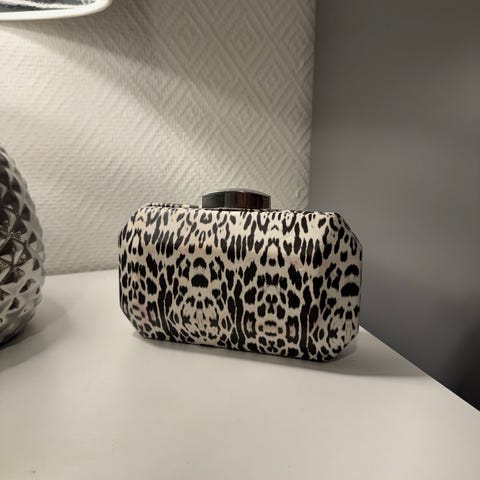 Gina Tricot clutch-laukku. Materiaalina tekonahka. Laukussa on musta pinta ja läppäosassa kontrastina vaalea käärmekuvioinen osa. Suljenta tapahtuu magneettineppareilla. Koko on noin kirjekuorimallinen, sisälle mahtuu puhelin, lompakko ja avaimet ainakin.