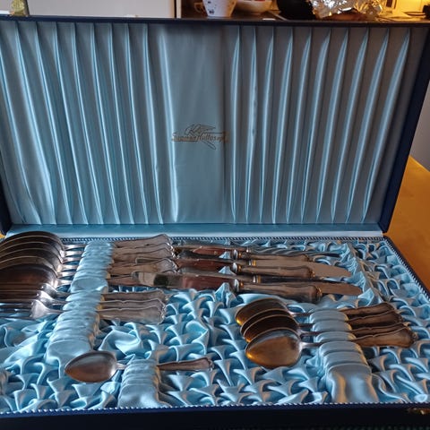 Sorsakosken Musla malliset ruokailuvälineet. Uus hopeaa eli alpakkaa. Painavat ja mukaan tulee näiden laatikko. Kaksi pikku lusikkaa on hävinnyt ja ne on korvattu Muslan teräs versioilla. Postitus sovitaan erikseen ja kulut ostajalle.
