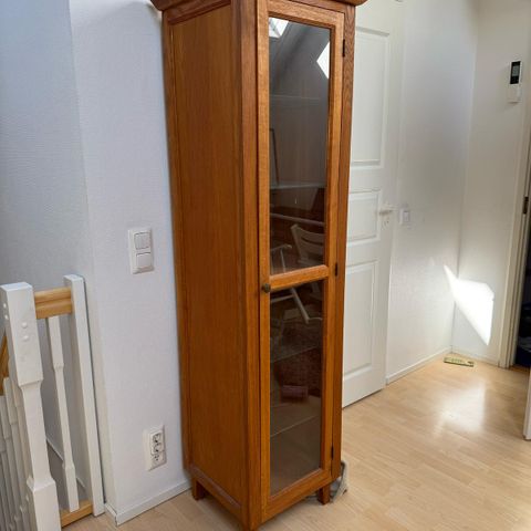 Hyväkuntoinen tamminen vitriinikaappi. Vitriiniosassa (ylhäällä) on taustavalot. Kaapin koko on 90 x 41 x 181,5 cm.