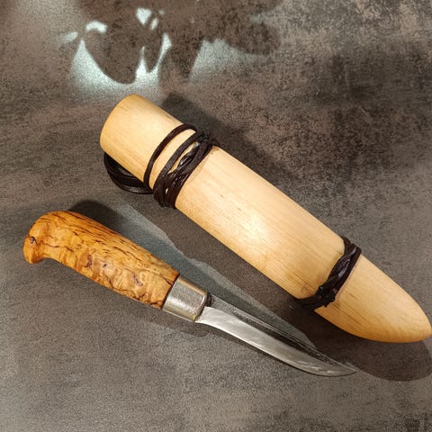 Todella hieno puukko ja tyylikäs tuppi. Hyväkuntoinen. Terässä pientä naarmua. Hopeaosia ei ole kiillotettu.