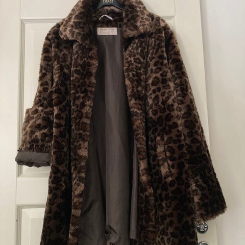 Vähälle käytölle jäänyt vuorillinen , tummanruskea tekoturkki. Reilunkokoinen huppu ( ei irrotettavassa), kaksi taskua, kokovuori . Mittoja: kai-kai 70 cm, olka-helma 105 cm. Turkki on todella lämmin. Hp 60 e +pk 14.50 .