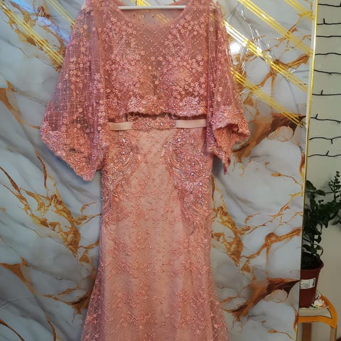 - Yläosan pitsin väri kaunis hohtava kupari, aluskangas ja hame persikanväristä hohtavaa kangasta, hameen päällä persikanvärinen sifonki. Hameessa aluspuku.