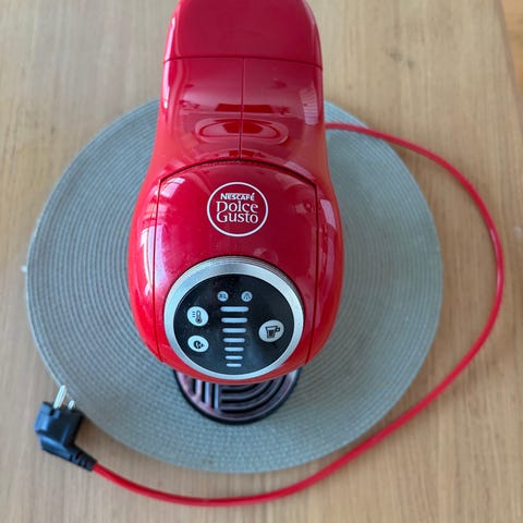 Dolce Gusto kapselikahvinkeitin kotikäyttöön. Laitteessa on musta runko, läpinäkyvä vesisäiliö ja punainen virtajohto. Yläosassa on painikkeet juoman koon ja lämpötilan säätöön sekä käynnistys- ja pysäytystoiminnot. Sopii Dolce Gusto -kahvikapseleille erilaisten kuumien juomien valmistukseen, kuten kahvi, espresso ja kaakao.