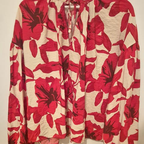 Lindex marjapuuron värinen paita L. Etupuolella kaksi kangasta, päällimmäinen ohut hiukan läpinäkyvä materiaali, löysähköt hihat, kivasti laskeutuu päälle