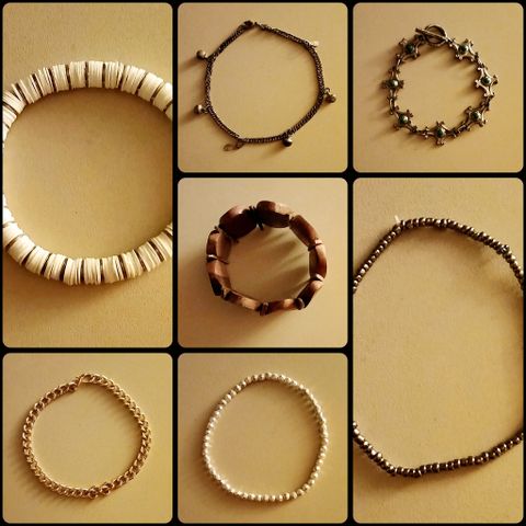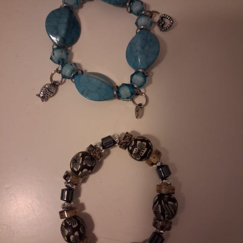 Kaksi Global-merkin rannekorua, joissa ketjussa paljon, ilmeisesti metallisia, helmiä.