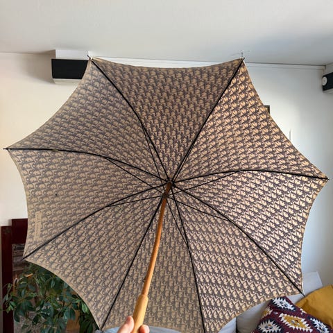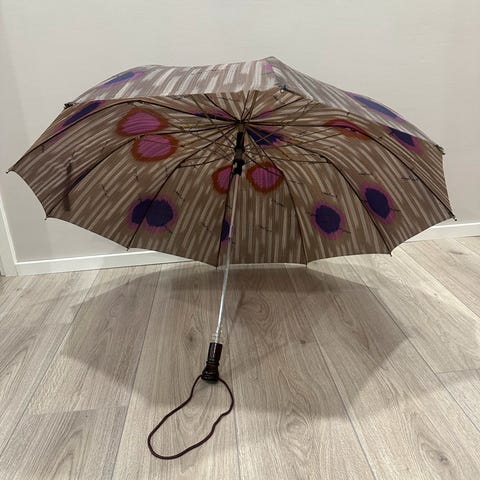 Ruskea kangas hieman normaalia sateenvarjokangasta paksumpaa 100 % polyesterisatiinia. Halkaisija n. 90 cm.