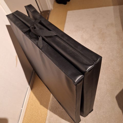 Jumppamatto on kulunut muutamasta kulmasta mutta muuten hyväkuntoinen.