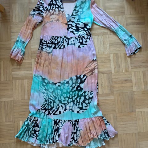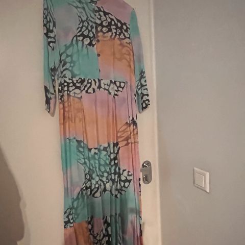 Vimma arkimekko naisille, koko onesize mutta menee S-L kokoiselle hyvin. Materiaalina puuvilla. Mekossa on monivärinen, kirjava sienikuosi ja noin 3/4-pituiset hihat.