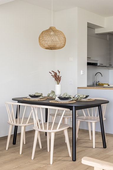 Pöydässä on kauniit pyöristetyt muodot ja siinä on erityisesti lapsiperheille sopiva, kestävä pinta.