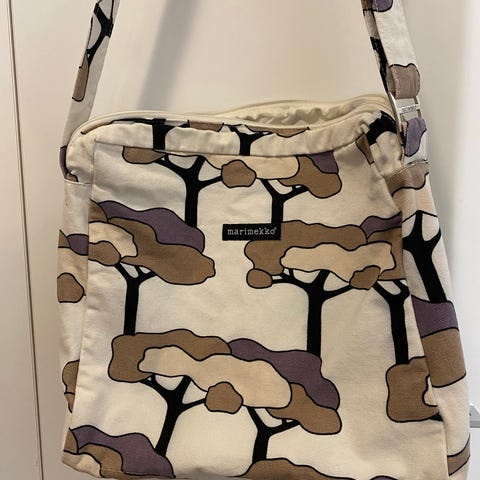 Marimekko olkalaukku unisex-käyttöön. Laukku on valmistettu kankaasta ja siinä on säädettävä olkahihna. Edessä ja takana on vetoketjutaskut pienille tavaroille. Päälokerossa on vetoketjusuljenta ja sisällä useampi lokero tavaroiden erotteluun. Sopii arjen käyttöön ja mukaan esimerkiksi kaupungille tai matkoille.