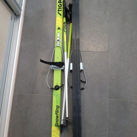 Stiga Snowfling lasten sukset. Kiinnitys suoraan saappaisiin. Sukset 110cm, sauvat 85cm.