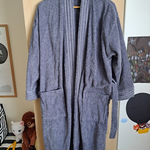 Finlayson Reilu kylpytakki koossa L/XL. Väri on harmaa. Kylpytakissa on vyö ja huppu.