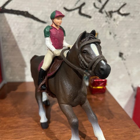 Tässä Ella menee Englannin täysverisellä. Hyvin mätsää hepan vihreät pompulat ja satulan lila väritys Ellan asuun. Varusteet ehjät. Hepassa pientä kulumaa.