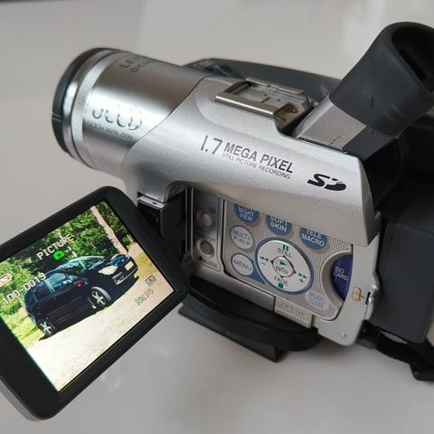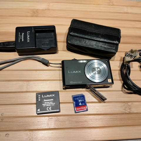 Panasonic videokamera olkalaukulla. Kamerassa hihna ja objektiivinsuoja. Sopii videokuvaukseen esimerkiksi koti- ja matkakäytössä. Tarkempia teknisiä tietoja tai mallimerkintää ei ole näkyvissä kuvassa.