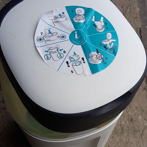 Tosi siisti vaaleanpunainen vaipparoskis. Piti hajut hyvin poissa ja mahtuu monta vaippaa. Voi käyttää tavallisia muovipusseja.