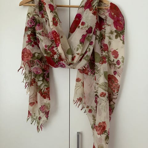 Ruskea todella hyväkuntoinen huivi, jossa ruusu kuviointeja ja kimaltelevia perhosia.
