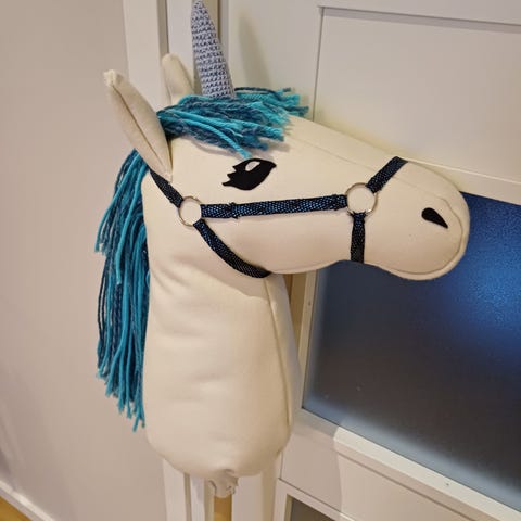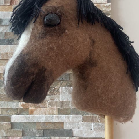 Käsintehty keppihevonen. Materiaalina huovutettu villa. harmaanruskea runko ja monisävyinen harja (vaalean ja tumman harmaan sekä beigen sävyjä). Hevosen pää on muotoiltu, ja pinnassa on pilkkumainen kuviointi. Sopii leikkeihin tai koristeeksi.