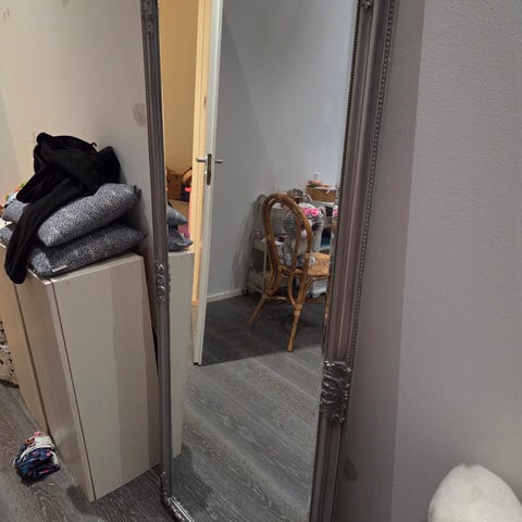 Jysk kokovartalopeili, jossa hopeanvärinen, koristeellinen kehys.