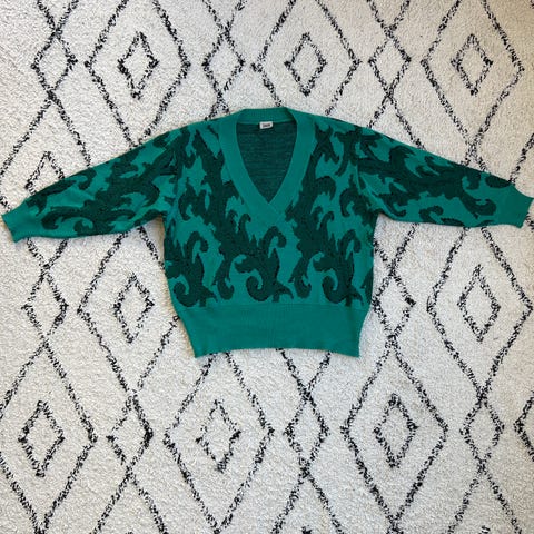80-/90-luvun tyylikäs vintage-neule. Italialainen retro desing merkkiä Sorgenti. Erittäin siistissä kunnossa pientä hihan tahraa ja reikää lukuunottamatta, ne näkyvät viimeisissä kuvissa. Materiaali villaa ja akryylia.