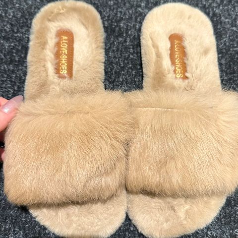 Ruskeat lähes käyttämättä jääneet tohvelit koossa 38. Kokomerkintä 39, mutta paksun karvan takia vastaa mielestäni enemmän 38 ja siksi jääneet käyttämättä. Pohjassa pientä likaa, mutta muuten oikein siistissä kunnossa. Karva edelleen tosi muhkea.