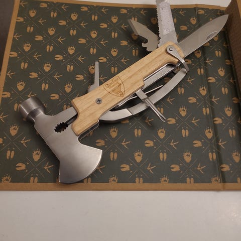 Avaamaton pakkaus jossa veitsi, teroitustyökalu (33 ja 40 asteen kulmilla) sekä kantopussi.