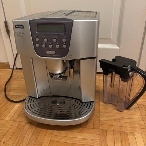 De'Longhi Magnifica ESAM4500 espressokeitin. Täysautomaattinen kahvikone, jossa on integroidut kahvimylly ja papusäiliö sekä erillinen vesisäiliö. Laitteessa on digitaalinen näyttö ja painikkeet kahvin asetusten säätöön. Etuosassa on kahvisuutin ja tippakaukalo, sivussa irrotettava maitosäiliö maitopohjaisia cappuccinoa ja lattea varten. Maitosäiliössä ajoittain ongelmia maidon nousussa ja vaatii konepesua / putsausta. Mahdollista myös että suuttimien O-renkaat pitäisi vaihtaa. Huomioitu hinnassa, muuten toimii moitteettomasti.