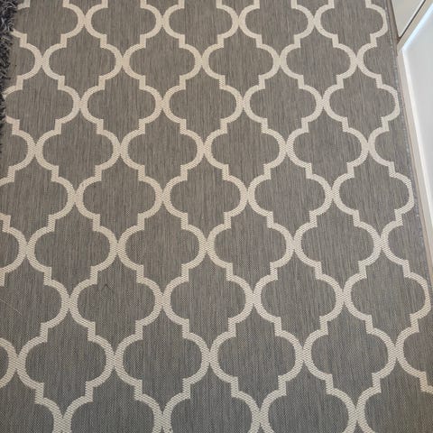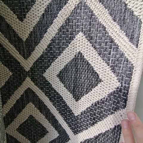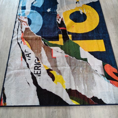 Rustan JUNA-matto, jossa monivärinen geometrinen kuvio. Ollut käytössä nöin kaksi viikkoa, den jälkeen varastossa. Käytännössä siis uusi :)