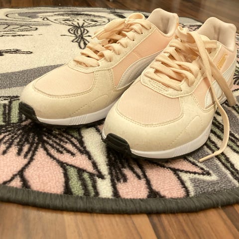 Prosec juoksukengät, koko 39. Väri pääosin valkoinen, yksityiskohtia harmaalla ja kullansävyllä. Nauhakiinnitys ja kumipohja, jossa kuvioitu pinta pidon parantamiseksi. Soveltuvat juoksuun ja muuhun liikuntaan.Hyvä kunto ei kulumaa.Voin pestä pohjat vielä.