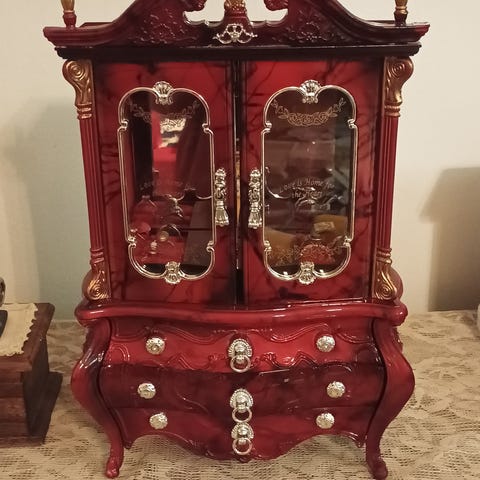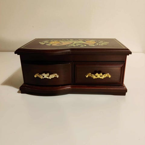 Itse tuunattu ja koristeltu. Korkeus 9cm, leveys 20cm ja syvyys 13cm. Sou hyvin, en tunnista kappaletta. Kun ostin käytettynä oli huonossa kunnossa joten kunnostin. Voi olla aika vanha sillä puusta tehty. Alkuperäiset jalat olivat muovia joten vaihdoin ne. Sisäkangas oli myös vahingoittunut joten vaihdoin sen myös. Itsellä ei tullut tälle käyttöä. Hyvä korutasiaksi.