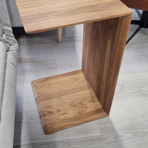 Tämä S-kirjaimen muotoinen tamminen sivupöytä sopii täydellisesti yöpöydäksi. Avoimelta pöydältä löydät nopeasti tarvitsemasi!