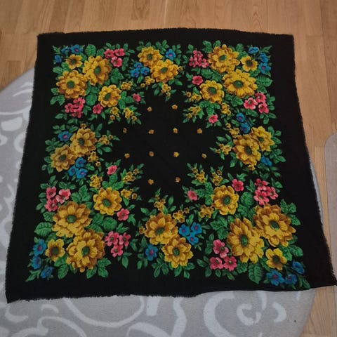 Vintage kukkahuivi ilmeisesti villaa. Iso koko noin 140×140 cm. Muutamassa kohtaa pieniä reikiä..ei haittaa käyttöä. Katso kuvat. Voin postittaa.
