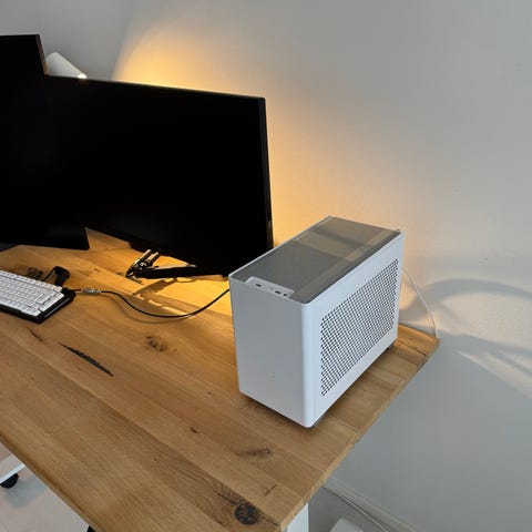 MSI pöytätietokone. Valkoinen kotelo sivuikkunalla. Kokoonpanossa on erillinen näytönohjain