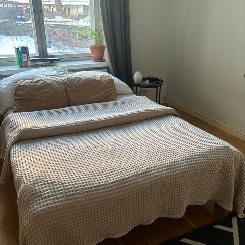 Sängyn alla on kaksi isoa säilytyslaatikkoa.
