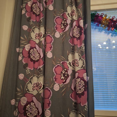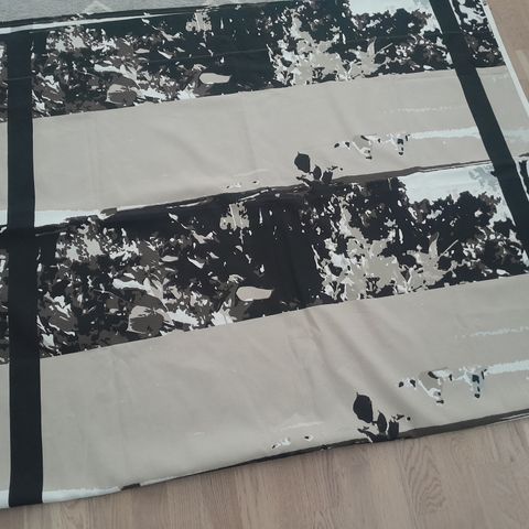 Uusi Niagara Vallila verho. 1 ylimääräinen paketissa. Musta kullan/"pronssin" väriset kuviot. 144×250. Tankokuja. Ohut läpikuultava.