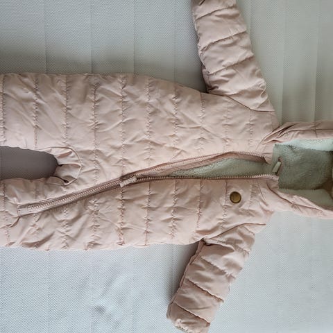 H&M vauvan toppahaalari, koko 62, unisex-malli. Ruskea, tikattu ulkopinta ja vaalea pehmeä vuori. Haalarissa on huppu ja vino etuvetoketju helpottamassa pukemista. Sopii vauvalle ulkoilu- ja vaatekerroshaalariksi viileämpiin säihin.
