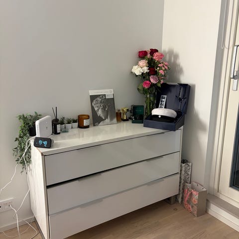 White chest of drawers with cabinet and open shelving
