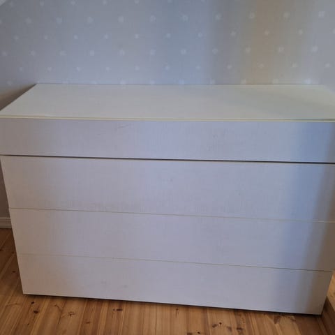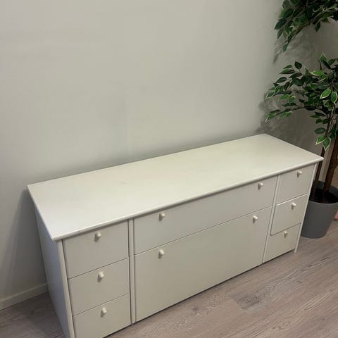 Valkoinen lipasto, jossa yksi ovellinen kaappi, viisi vetolaatikkoa ja avohylly kahdella tasolla. Runko ja ovet vaaleaa, maalattua tai laminoitua puulevyä, takalevy ruskea. Metalliset vetimet laatikoissa ja kaapin ovessa. Soveltuu esimerkiksi makuuhuoneeseen, olohuoneeseen tai eteiseen säilytyskalusteeksi vaatteille, liinavaatteille tai muille tavaroille. Hieman painava, vaatii kaksi henkilöä. Vain nouto.