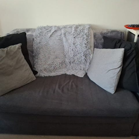 Kaksipaikkainen sohva, jossa tummanharmaa runko ja kukkakuvioidut istuin- ja selkätyynyt. Verhoilumateriaalina on kangas. Sohva sopii pieneen olohuoneeseen, työhuoneeseen tai vierashuoneeseen istumapaikaksi. Selkänojassa on kaksi irtotyynyä, jotka helpottavat puhtaanapitoa ja järjestelyn muuntelua. Sohva sijoittuu kuvissa seinän viereen ja maton päälle, ja sen mitoitus vaikuttaa kompaktin kokoiselta, mikä sopii hyvin pienempiin tiloihin.