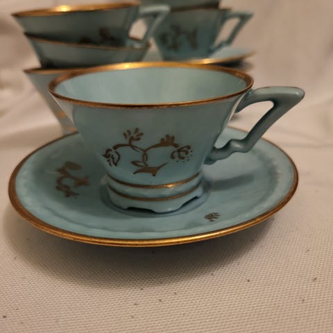 Eri kokoiset astiat signeerauksilla.