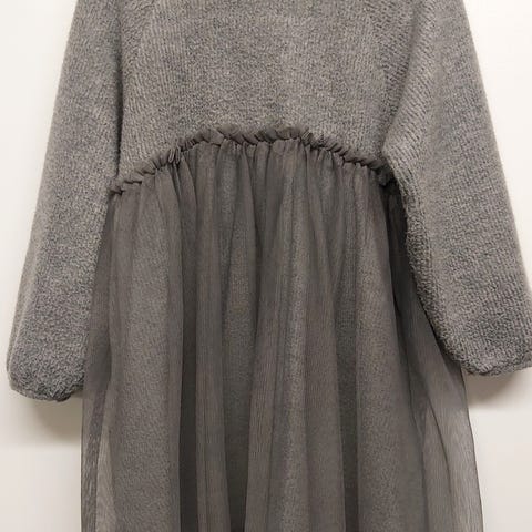 Zara mekko tytöille, koko 98 cm (noin 3 vuotta). Mekossa on harmaa neulottu yläosa ja ruudullinen helma. Pyöreä pääntie ja pitkät hihat. Sopii arki- ja juhlakäyttöön lapselle, joka käyttää kokoa 98.