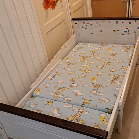 Myydään tukeva ja täyspuinen jatkettava lastensänky. Pituus ilman jatkopalaa 120 cm, jatkopalan kanssa pituus 160 cm. Jalkopäädyn maalipinnassa vähän kulumaa