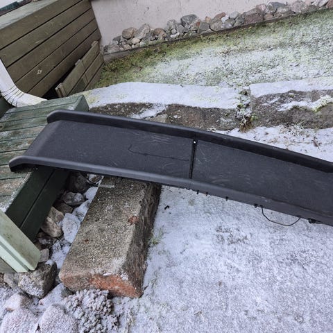 Myydään Calmbed-merkkinen ramppi koirille. Ollut käytössä vain hetken. Runko vaaleaa puuta, päällä musta kumimatto joka estää hyvin tassujen luistamisen.