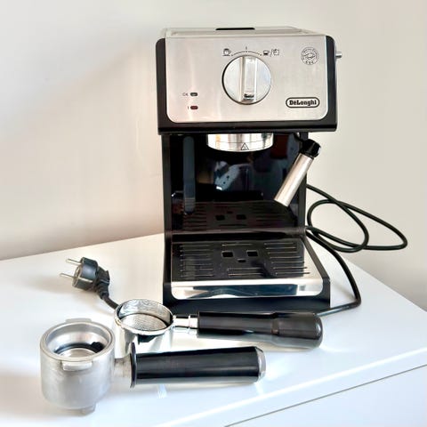 Kenwood kahvikone. Laitteessa on teräsrunko ja irrotettava tippakaukalo. Edessä on kolme painiketta kahvinvalmistusta ja laitteen käyttöä varten. Mukana tulee portafilter-kahva. Sivussa on höyrysuutin maidon vaahdotukseen. Mukaan myös laadukas DeLonghi kone kahvipapujen jauhatukseen.